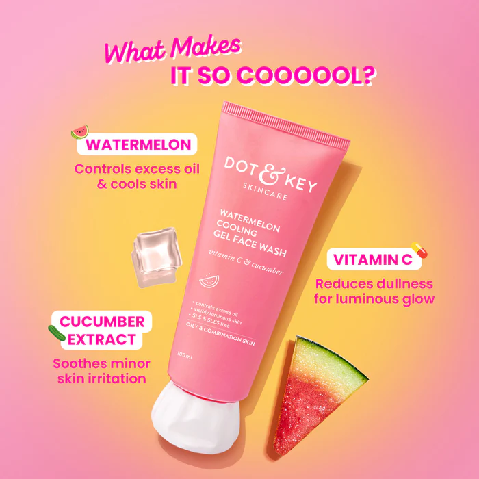 Dot & Key Watermelon Cooling Gel Face Wash gently cleanses and refreshes your skin with a burst of hydration. Enriched with watermelon and cucumber extracts for a soothing, cooling experience.